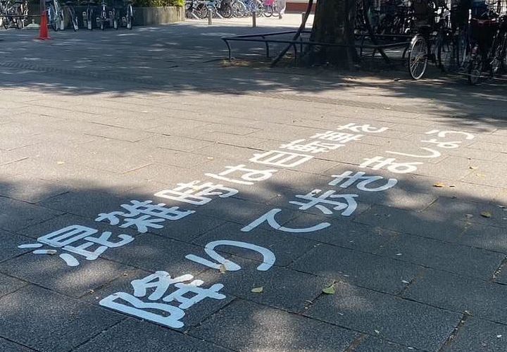 路面に「混雑時は自転車を降りて歩きましょう」という注意喚起を表示していただくことになり、