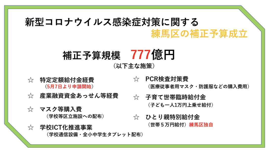 「練馬区5月補正予算成立」し、明日7日より申請開始となる定額給付金をはじめとした様々な支援策の第一弾となります。