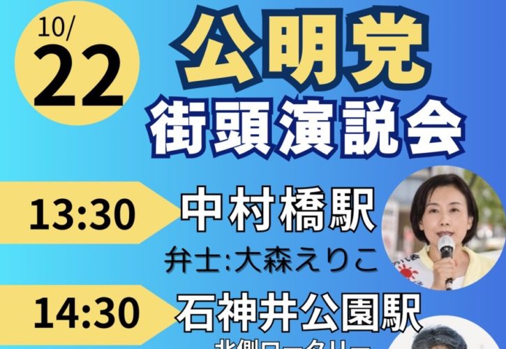 あす10月22日(火曜)練馬区内を公明党候補が力強いお訴えをさせて頂きます。